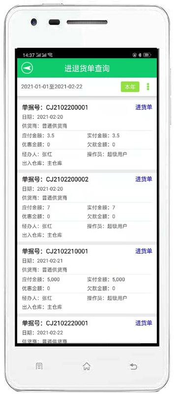 | 進貨管理:進行商品采購入庫,采購退貨,進/退單據(jù)和當前庫存查詢,與供貨商的往來帳務。 | |||