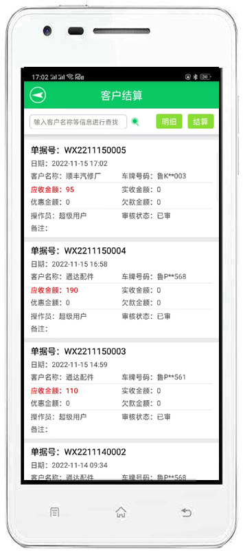 | 客戶結(jié)算:可能根據(jù)客戶進(jìn)行結(jié)算,也可以查詢單據(jù)號的方式進(jìn)行結(jié)算。完成對客戶未結(jié)算單據(jù)維修項目調(diào)整,客戶付款,對未結(jié)清單據(jù)進(jìn)行批量還款以及對未結(jié)清尾款進(jìn)行優(yōu)惠等操作。 | |||