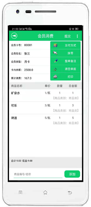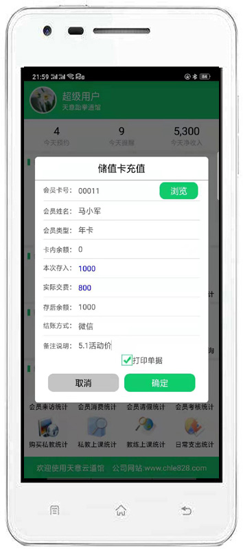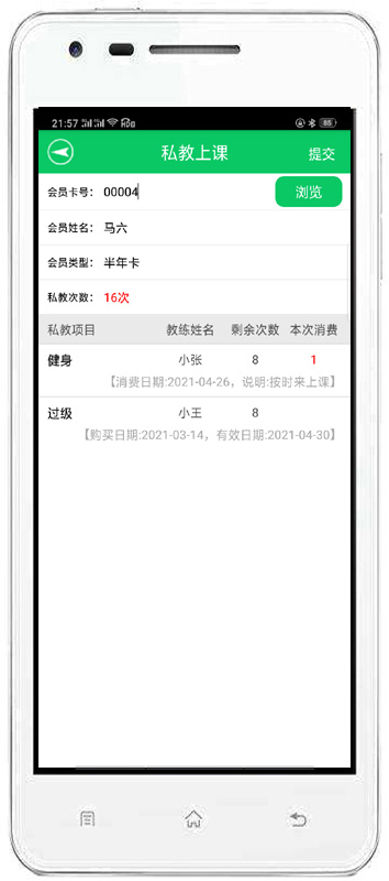 | 該功能可以對會員刷卡登記和會員消費店內(nèi)商品進行管理。同時也可以管理兌換商品、充值、私教。 |