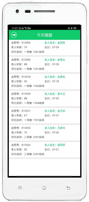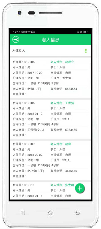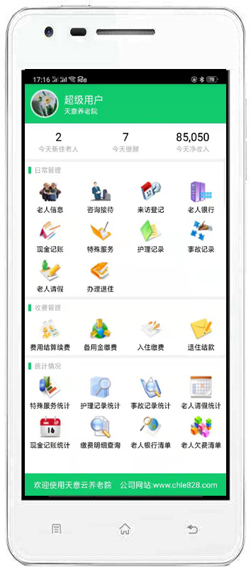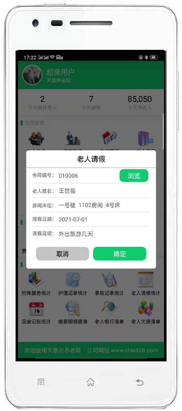 | 3、老人管理:主要包括入住管理、請(qǐng)假管理、特殊服務(wù)、辦理退住、護(hù)理記錄、事故記錄、生日提醒、媒介渠道對(duì)比等內(nèi)容。 | |||