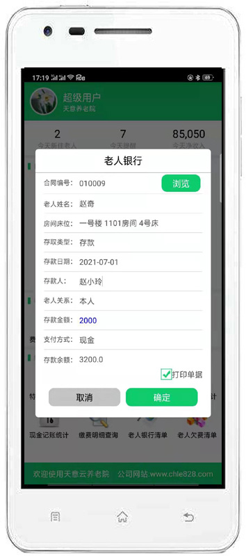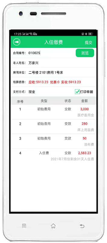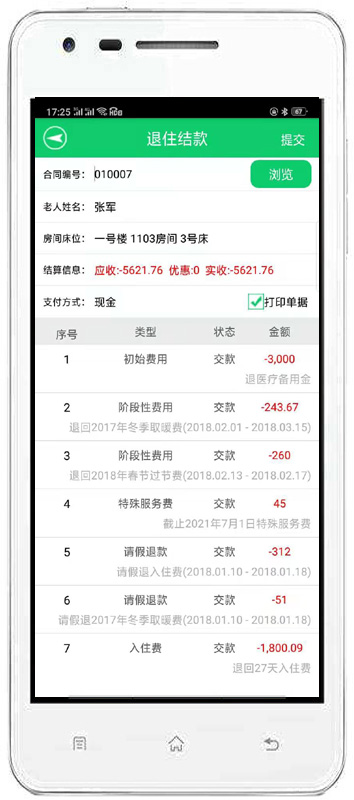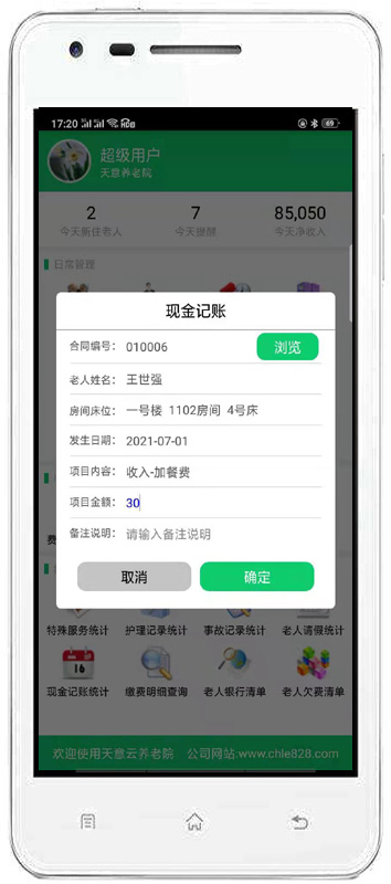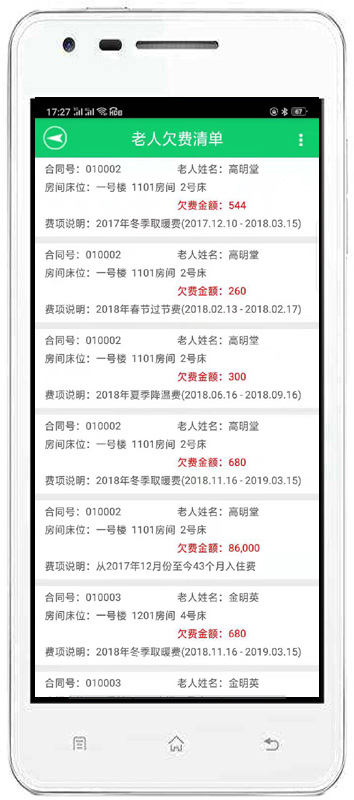 | 4、收費(fèi)管理:主要包括費(fèi)用結(jié)算及續(xù)費(fèi)、備用金繳費(fèi)、入住繳費(fèi)、退住結(jié)款、現(xiàn)金記賬、老人銀行清單、繳費(fèi)明細(xì)查詢、老人欠費(fèi)清單等內(nèi)容。 | |||