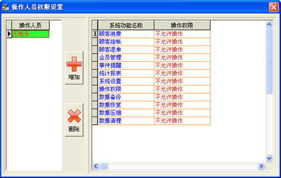 | ·點(diǎn)擊菜單“系統(tǒng)維護(hù)→操作權(quán)限”進(jìn)入操作權(quán)限設(shè)置界面。 ·進(jìn)入“操作人員權(quán)限設(shè)置”窗口中,如需增加操作人員,請(qǐng)點(diǎn)擊“增加”按鈕,錄入操作人員名稱和操作密碼,注意操作人員名稱不能相同。 ·如需刪除某操作人員,請(qǐng)點(diǎn)擊“刪除”按鈕。 ·系統(tǒng)默認(rèn)操作人員所有權(quán)限為“不允許操作”,如允許某項(xiàng)操作,請(qǐng)點(diǎn)擊該項(xiàng)“不允許操作”,顯示“是否允許操作”前點(diǎn)擊打勾即可。 |
