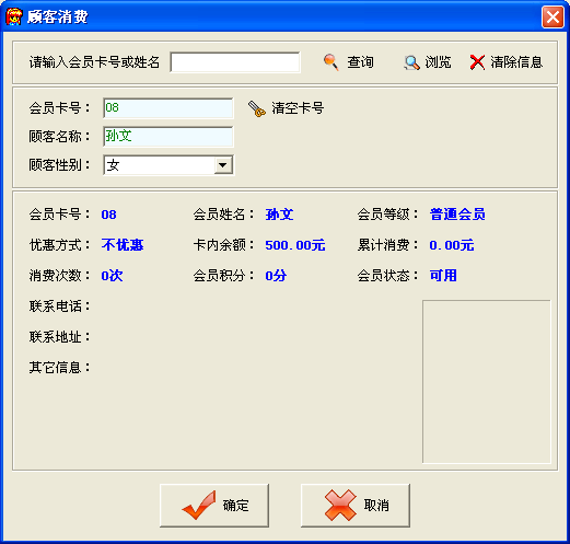 | ·點(diǎn)擊“添加會(huì)員”按鈕,在會(huì)員信息錄入窗口中輸入會(huì)員相應(yīng)的信息。 ·點(diǎn)擊“修改信息”按鈕,可以修改相應(yīng)的數(shù)據(jù)。 ·點(diǎn)擊“刪除會(huì)員”按鈕,可以刪除該會(huì)員信息。 ·會(huì)員卡操作:當(dāng)儲(chǔ)值卡需要充值時(shí),點(diǎn)擊“會(huì)員續(xù)費(fèi)”按鈕進(jìn)行充值。在“其它操作”中包括會(huì)員卡掛失、取消掛失、會(huì)員換卡、會(huì)員卡轉(zhuǎn)帳、查看會(huì)員卡信息。會(huì)員換卡操作,只需在“會(huì)員換卡”窗口中輸入新的會(huì)員卡號(hào),不需要再輸入會(huì)員基本信息系統(tǒng)自動(dòng)將舊卡內(nèi)的所有信息轉(zhuǎn)移到新卡內(nèi)。會(huì)員轉(zhuǎn)帳操作,當(dāng)儲(chǔ)值卡會(huì)員不再使用此卡但卡內(nèi)還有余額,可以轉(zhuǎn)到指定的儲(chǔ)值卡內(nèi)。本系統(tǒng)不支持儲(chǔ)值卡退款功能。 |