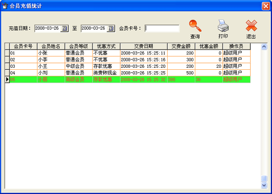 | ·點(diǎn)擊菜單“統(tǒng)計(jì)報(bào)表→會(huì)員充值統(tǒng)計(jì)”進(jìn)入會(huì)員充值統(tǒng)計(jì)界面。 ·進(jìn)入“會(huì)員充值統(tǒng)計(jì)”窗口中,系經(jīng)統(tǒng)默認(rèn)顯示在數(shù)據(jù)表中的充值數(shù)據(jù)為當(dāng)天的充值明細(xì)?梢赃x擇需要查詢“充值日期”的起始日期和截止日期,在“會(huì)員卡號(hào)”后的文本框中輸入想查詢的條件,點(diǎn)擊“查詢”按鈕即可在本窗口中的數(shù)據(jù)窗口中顯示出符合查詢條件的信息。點(diǎn)擊“打印”按鈕,可將當(dāng)前數(shù)據(jù)表中顯示的數(shù)據(jù)打印輸出到已連接并能正常工作的打印機(jī)上。點(diǎn)擊“退出”按鈕,退出本窗口。 |