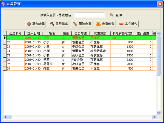 | 2.4 會(huì)員管理: 功能 此操作將完成本店會(huì)員信息的錄入、修改、刪除及續(xù)費(fèi)等功能。 | |||