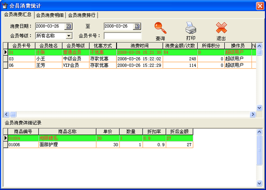 | 2.6.2 會(huì)員消費(fèi)統(tǒng)計(jì): 功能 用于查詢本店會(huì)員在指定時(shí)間段內(nèi)消費(fèi)情況。 | |||