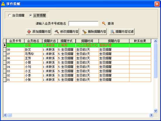 | 2.5 事件提醒:功能 此操作將完成本店會(huì)員提醒預(yù)約內(nèi)容的添加、修改、刪除及過濾等功能。 | |||
