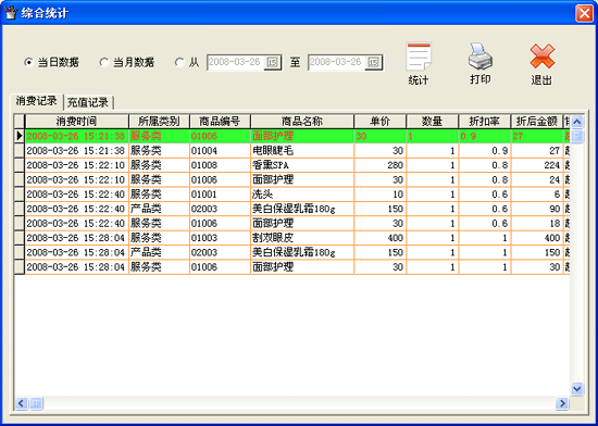 | ·點(diǎn)擊菜單“統(tǒng)計(jì)報(bào)表→綜合統(tǒng)計(jì)”進(jìn)入綜合統(tǒng)計(jì)界面。 ·進(jìn)入“消費(fèi)記錄”窗口中,有三種查詢方式,即“當(dāng)天數(shù)據(jù)”、“當(dāng)月數(shù)據(jù)”和“按時(shí)間段查詢”,需要哪種查詢方式可以在其前點(diǎn)擊,然后點(diǎn)擊“統(tǒng)計(jì)”按鈕即可在本窗口中的數(shù)據(jù)窗口中顯示出符合查詢條件的信息。點(diǎn)擊“打印”按鈕,可將當(dāng)前數(shù)據(jù)表中顯示的數(shù)據(jù)打印輸出到已連接并能正常工作的打印機(jī)上。點(diǎn)擊“退出”按鈕,退出本窗口。 ·進(jìn)入“充值記錄”窗口中的操作方式同上。 |