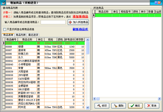 在“增加商品”窗口中分為兩部分,左邊的是商品信息,右邊是已選商品。在“商品編號或名稱”后的文本框中可以輸入商品編號或商品名稱就可以查詢到相應(yīng)的商品信息,商品信息可以分為三類如圖,商品清單是所有的商品,商品列表是所有的類別,每個(gè)類別又對就相應(yīng)的商品,最近進(jìn)貨是最近時(shí)間進(jìn)的商品。選中相應(yīng)的商品點(diǎn)擊“添加”按鈕,在出現(xiàn)的窗口中輸入?yún)⒖歼M(jìn)價(jià)和數(shù)量就可以把該商品增加到所選商品中。所選商品中的“修改”“刪除”按鈕是對所選商品進(jìn)行修改和刪除操作的。點(diǎn)擊“保存”按鈕把所選商品中的商品保存到采購進(jìn)貨窗口中。再點(diǎn)擊采購進(jìn)貨的“保存”按鈕來保存。