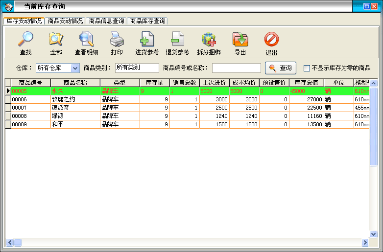 在進(jìn)貨管理中點(diǎn)擊“當(dāng)前庫存查詢”按鈕打開庫存查詢窗口: