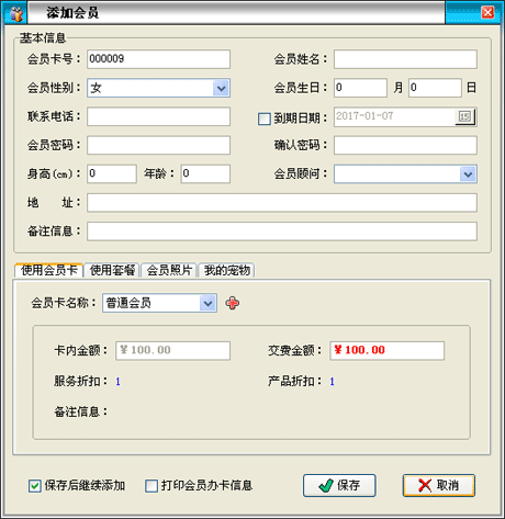 | 為了方便辦理會(huì)員卡,前臺(tái)增加了這個(gè)功能。詳細(xì)介紹見會(huì)員管理模塊。 | ||