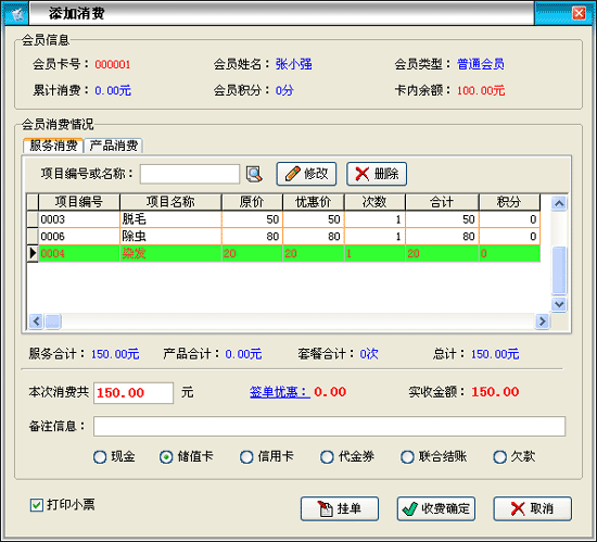 掛單功能:這個(gè)會(huì)員可能當(dāng)時(shí)沒有立即結(jié)賬,下次刷卡后打開增加消費(fèi)窗口會(huì)直接彈出上次臨時(shí)保存的消費(fèi)記錄。 欠款功能:欠款可以選擇部分欠款或全部欠款,這是處理消費(fèi)欠款的一種解決辦法。