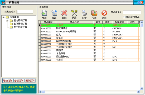 在商品信息窗口中左邊是商品類別,右邊列表中是該類別對應(yīng)的商品。可以新增類別,重命名和刪除類別。新增的類別是屬于所選類別的下一級,如果類別下有商品存在則該類別是不能被刪除的。在類別名稱后的文本框中可以輸入類別名稱或類別簡碼來查詢需要的類別。