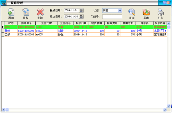 ·此功能用于登記業(yè)主報(bào)修改的信息。對(duì)報(bào)修的內(nèi)容,所需耗費(fèi)的資金、維修狀態(tài)、報(bào)修日期、預(yù)訂完工日期及維修情況進(jìn)行登記,以便跟蹤服務(wù)。 |