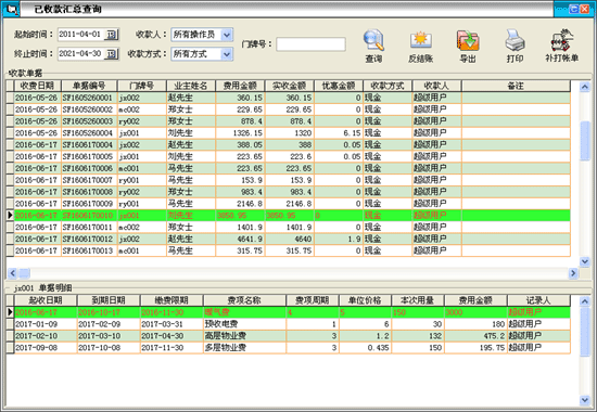 ·主要用來(lái)查詢物業(yè)收費(fèi)管理人員的收費(fèi)情況,以明確在一段時(shí)間內(nèi)某個(gè)收費(fèi)員的收費(fèi)金額和明細(xì),做到有據(jù)可查。 |
