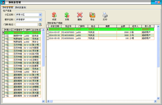 ·此窗口左側(cè)顯示所有業(yè)主,點(diǎn)擊某個(gè)業(yè)主在窗口右半部分可以顯示此業(yè)主預(yù)收款明細(xì) |
