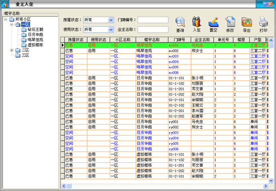 | 在收費(fèi)管理模塊中點(diǎn)擊“業(yè)主入住”進(jìn)入業(yè)主入住界面如圖: