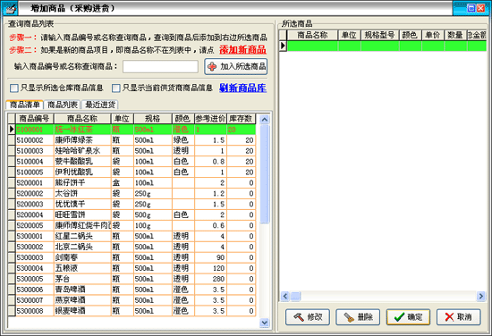 在“增加商品”窗口中分為兩部分,左邊的是商品信息,右邊是已選商品。在“商品編號或名稱”后的文本框中可以輸入商品編號或商品名稱就可以查詢到相應(yīng)的商品信息,商品信息可以分為三類如圖,商品清單是所有的商品,商品列表是所有的類別,每個類別又對就相應(yīng)的商品,最近進(jìn)貨是最近時間進(jìn)的商品。選中相應(yīng)的商品點(diǎn)擊“添加”按鈕,在出現(xiàn)的窗口中輸入?yún)⒖歼M(jìn)價和數(shù)量就可以把該商品增加到所選商品中。所選商品中的“修改”“刪除”按鈕是對所選商品進(jìn)行修改和刪除操作的。點(diǎn)擊“保存”按鈕把所選商品中的商品保存到采購進(jìn)貨窗口中。再點(diǎn)擊采購進(jìn)貨的“保存”按鈕來保存。