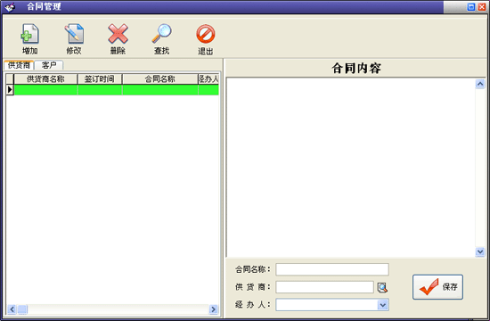 '增加'、'修改'、'刪除'按鈕將針對該供貨商的合同進(jìn)行操作。