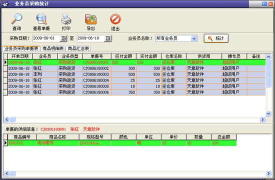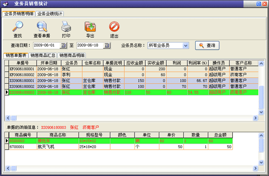 業(yè)務(wù)員業(yè)績情況:以表格形式在'單據(jù)記錄'欄內(nèi)顯示該業(yè)務(wù)員經(jīng)辦的采購、采購?fù)素、客戶付款記錄、商品銷售、銷售退貨、客戶付款情況,在'詳細(xì)內(nèi)容'欄內(nèi)顯示相應(yīng)'采購'或'銷售'等記錄所對應(yīng)的詳細(xì)商品信息;