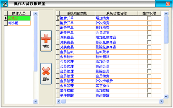 | ·點擊菜單“系統(tǒng)維護→操作權(quán)限”進入操作權(quán)限設(shè)置界面。 ·進入“操作人員權(quán)限設(shè)置”窗口中,如需增加操作人員,請點擊“增加”按鈕,錄入操作人員名稱和操作密碼,注意操作人員名稱不能相同。 ·如需刪除某操作人員,請點擊“刪除”按鈕。 ·系統(tǒng)默認(rèn)操作人員所有權(quán)限為“不允許操作”,如允許某項操作,請點擊該項“不允許操作”,顯示“是否允許操作”前點擊打勾即可。 |