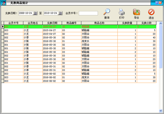 | ·點擊菜單“統(tǒng)計報表→兌換商品統(tǒng)計”進入兌換商品統(tǒng)計界面。 ·進入“兌換商品統(tǒng)計”窗口中,系經(jīng)統(tǒng)默認(rèn)顯示在數(shù)據(jù)表中的兌換數(shù)據(jù)為當(dāng)天的兌換商品明細(xì)。可以選擇需要查詢“兌換日期”的起始日期和截止日期,在“會員卡號”后的文本框中輸入想查詢的條件,點擊“查詢”按鈕即可在本窗口中的數(shù)據(jù)窗口中顯示出符合查詢條件的信息。點擊“打印”按鈕,可將當(dāng)前數(shù)據(jù)表中顯示的數(shù)據(jù)打印輸出到已連接并能正常工作的打印機上。點擊“退出”按鈕,退出本窗口。 |