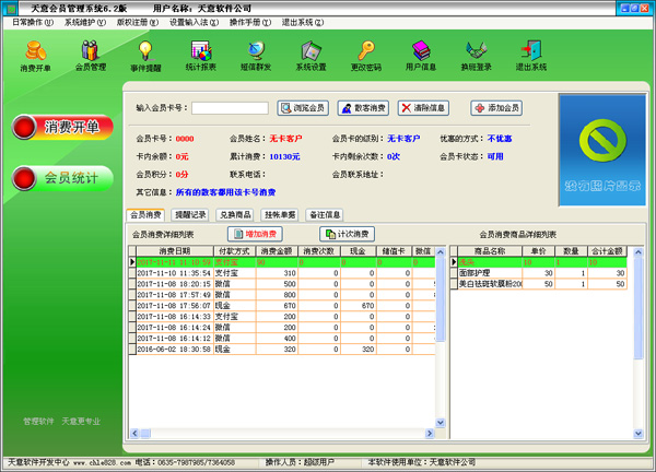 天意會員管理系統(tǒng)是一套功能強大的會員管理系統(tǒng)(會員卡管理系統(tǒng)、客戶管理系統(tǒng)),軟件將會員消費、會員基本信息以及各種查詢統(tǒng)計等緊密結(jié)合起來,操作簡單方便,界面美觀大方,能滿足如銷售、餐飲、美容、服務(wù)等行業(yè)進行會員制管理、會員卡管理、會員積分管理、會員消費積分管理的需求,科學(xué)的管理方法會給您帶來更多的效益,天意會員管理系統(tǒng)是您工作的好幫手。整套系統(tǒng)功能強大,界面直觀,操作方便,價格低廉,可廣泛應(yīng)用于各類會員管理部門。