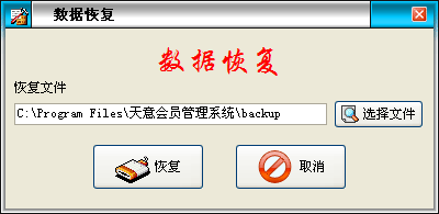 | ·點擊菜單“系統(tǒng)維護→數(shù)據(jù)恢復(fù)”進入數(shù)據(jù)恢復(fù)界面。 ·系統(tǒng)默認(rèn)備份路徑是當(dāng)前文件夾下的backup,如恢復(fù)其它路徑中的備份文件,可點擊“選擇文件”按鈕來更改恢復(fù)路徑,點擊“恢復(fù)”按鈕進行數(shù)據(jù)恢復(fù)。 |