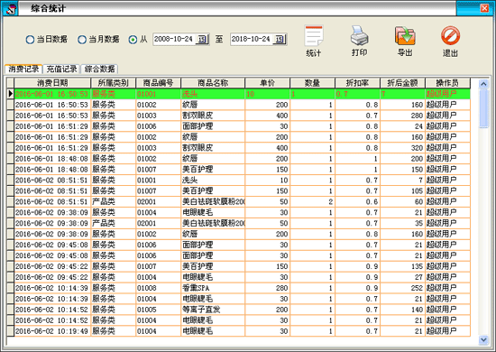 | ·點擊菜單“統(tǒng)計報表→綜合統(tǒng)計”進入綜合統(tǒng)計界面。 ·進入“消費記錄”窗口中,有三種查詢方式,即“當(dāng)天數(shù)據(jù)”、“當(dāng)月數(shù)據(jù)”和“按時間段查詢”,需要哪種查詢方式可以在其前點擊,然后點擊“統(tǒng)計”按鈕即可在本窗口中的數(shù)據(jù)窗口中顯示出符合查詢條件的信息。點擊“打印”按鈕,可將當(dāng)前數(shù)據(jù)表中顯示的數(shù)據(jù)打印輸出到已連接并能正常工作的打印機上。點擊“退出”按鈕,退出本窗口。 ·進入“充值記錄”窗口中的操作方式同上。 |