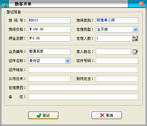 如果在顧客開單時填寫有誤,或者用于修改來賓姓名等可通過此項(xiàng)操作完成。 ·在選定需要修改登記的房間后, 通過點(diǎn)擊菜單 “來賓登記→修改登記”進(jìn)入修改登記界面。 ·進(jìn)入修改登記界面后,相應(yīng)的文框?qū)@示出顧客登記時的數(shù)據(jù),更改需要修改的項(xiàng)目。如:客人姓名、證件號碼、來賓人數(shù)。 ·填寫完之后,點(diǎn)擊 “確定” 按鈕將完成修改任務(wù),點(diǎn)擊 “取消” 按鈕將取消此次修改操作。 |