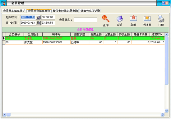 ·點(diǎn)擊菜單“會員管理→會員消費(fèi)信息”進(jìn)入會員消費(fèi)信息界面。 |