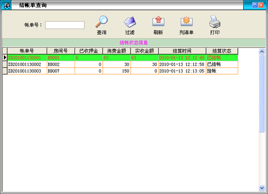 ·點(diǎn)擊菜單“營業(yè)查詢賬→結(jié)賬單查詢”進(jìn)入結(jié)賬狀態(tài)查詢界面。 |