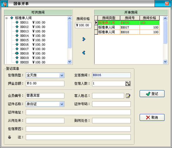 ·在選定某一處于“可供”或“預(yù)訂”狀態(tài)的房間后,通過點(diǎn)擊菜單“散客登記(團(tuán)體登記)→開單”進(jìn)入顧客開單界面。 |