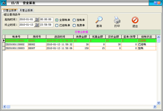 用分類查詢結(jié)賬賓客、掛賬賓客、免費(fèi)賓客、退單賓客的消費(fèi)情況。(主要為了分類統(tǒng)計(jì)已離店賓客的結(jié)賬狀態(tài))