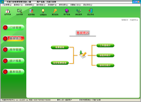| 3、查詢統(tǒng)計:主要包括收費查詢、劃價收費查詢、工作量統(tǒng)計、醫(yī)療費按醫(yī)師統(tǒng)計、醫(yī)療費按項目統(tǒng)計等內(nèi)容。 | |||