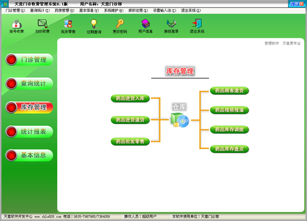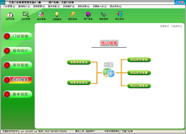天意門診收費管理系統(tǒng)是一款專業(yè)的門診收費管理軟件,具有門診劃價收費、藥品進銷存管理、醫(yī)生及科室工作量統(tǒng)計、藥品庫存及有效期報警管理等功能。天意門診收費管理系統(tǒng)符合GSP管理規(guī)范,界面設(shè)計簡潔美觀,其人性化的軟件流程,使普通用戶不需培訓也能很快掌握軟件操作使用方法。強大報表與集成查詢功能是本軟件的特色,所有功能在用戶需要使用的地方自然體現(xiàn)。軟件真正從用戶需求出發(fā),為基層醫(yī)院、鄉(xiāng)鎮(zhèn)衛(wèi)生院、私立醫(yī)院、企業(yè)職工醫(yī)院、社區(qū)衛(wèi)生服務中心、門診、診所、衛(wèi)生室等量身打造,是您進行門診收費信息化管理的強大工具。 |
