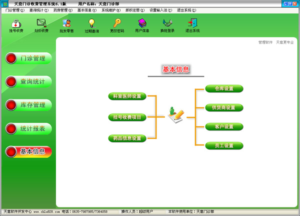 | 1、基本設(shè)置:主要包括科室醫(yī)師設(shè)置、掛號收費項目設(shè)置、藥品信息設(shè)置、倉庫設(shè)置、供貨商設(shè)置、客戶設(shè)置、員工設(shè)置等。 | |||
