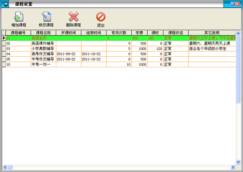 該模塊的功能主要是設(shè)置課程名稱、開課時間、結(jié)束時間、學(xué)費、有效次數(shù)、課時、課程狀態(tài)等信息。在本模塊設(shè)置的課程會在學(xué)員交費的窗口中顯示出來。 |