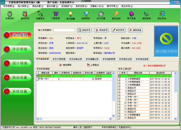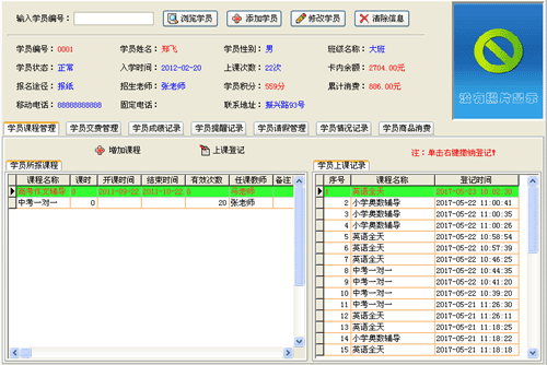 在“輸入學(xué)員編號“后的文本框中錄入學(xué)員編號即可查詢出相應(yīng)的學(xué)員,學(xué)員的基本信息也會顯示出來。如果該學(xué)員狀態(tài)、學(xué)員請假等特殊情況系統(tǒng)會給出相應(yīng)的提示。在該模塊中也可以進行課程管理、學(xué)員交費、學(xué)員提醒、學(xué)員請假、學(xué)習(xí)情況等操作。 |