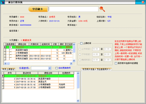 學(xué)員登記后會顯示出該學(xué)員的基本信息,如果該學(xué)員是否已畢業(yè)或該學(xué)員請假等特殊情況,系統(tǒng)會有提示。界面左下角顯示的是該學(xué)員登記的記錄,右下解顯示的是該學(xué)員的照片。 |