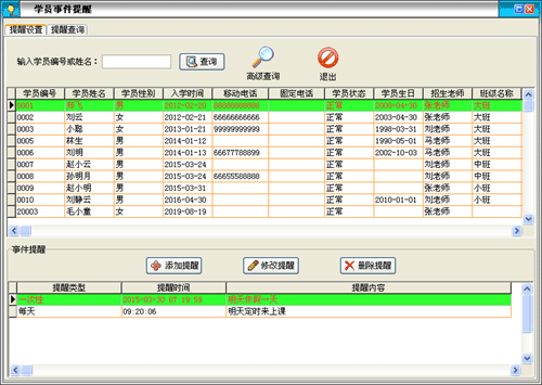 | 在學(xué)員管理中點擊“事件提醒”進入事件提醒界面如圖: