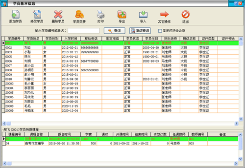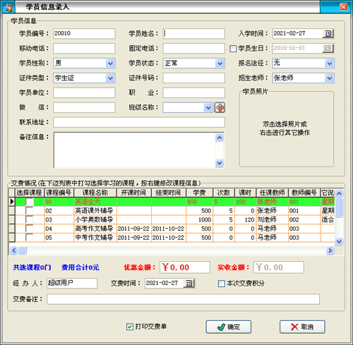 該窗口分兩部分:上邊是錄入學(xué)員的基本信息,下邊可以選擇學(xué)員所報的課程和交費情況。