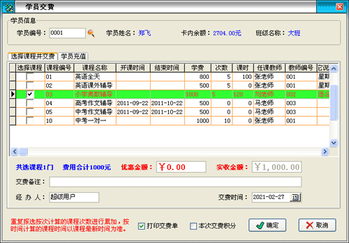 在該窗口中選擇學(xué)員所報課程,并錄入學(xué)員的交費情況即可。 |