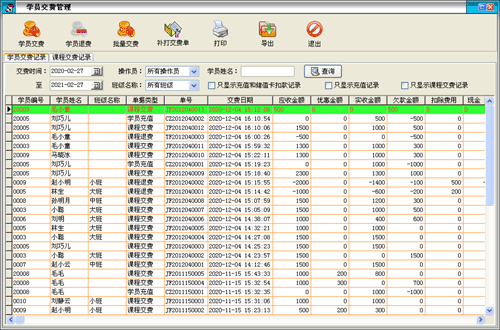 在該模塊中可以查詢到當(dāng)天,當(dāng)月和自定義日期的學(xué)員交費記錄和學(xué)員欠費記錄。在上邊工具欄中的“批量交費”功能是可以根據(jù)情況選擇多個學(xué)員進行交費。 |