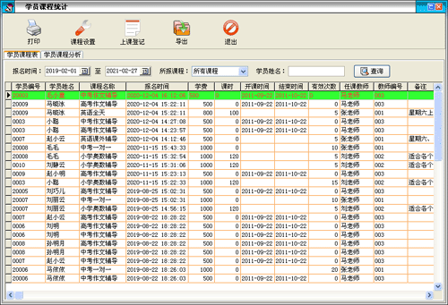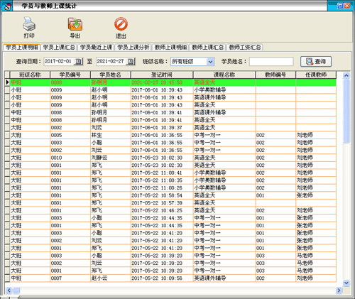 在該模塊中可以根據(jù)日期查詢出學(xué)員上課明細、學(xué)員上課匯總、學(xué)員最近上課情況、學(xué)員上課分析表。并且可以點擊“打印”對查詢出的記錄打印。 |