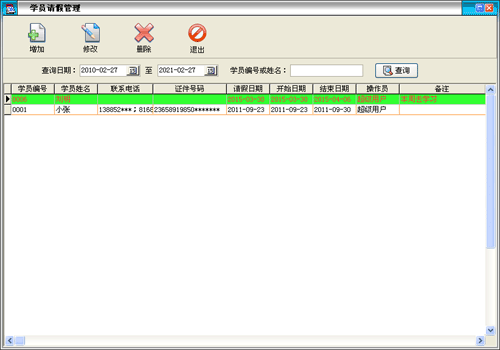 在該窗口中顯示的所有請假的學(xué)員,可以點擊增加按鈕來添加學(xué)員請假記錄。在學(xué)員請假的這段時間內(nèi)該學(xué)員是不能上課登記的。 |
