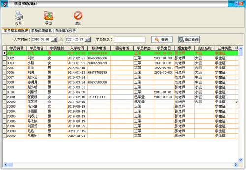在該模塊中可以根據(jù)入學(xué)時間查詢到學(xué)員的基本情況。并且可以點擊“打印”對查詢出的記錄打印。 |