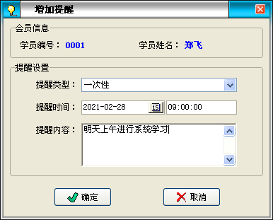 在窗口中上半部顯示的是所有的學(xué)員,下半部顯示的是當(dāng)前選中學(xué)員的提醒記錄。選中一個學(xué)員然后點擊“添加提醒”打開添加提醒窗口如圖: