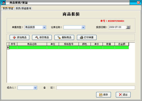 | 在庫存管理中點(diǎn)擊"報(bào)損報(bào)溢"按鈕,打開窗口: