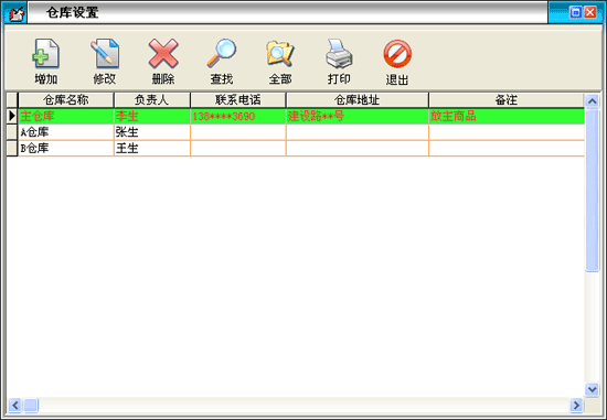在基本設(shè)置模塊中點(diǎn)擊“倉庫設(shè)置”按鈕打開倉庫設(shè)置窗口。在窗口中可以看到所有的倉庫。點(diǎn)擊“增加”按鈕打開增加倉庫窗口,輸入倉庫的信息,倉庫名稱不能重復(fù)。點(diǎn)擊“修改”按鈕可以修改選中的倉庫信息。點(diǎn)擊“刪除”按鈕可以刪除選中的倉庫。點(diǎn)擊“查找”按鈕打開倉庫查詢窗口,輸入相應(yīng)的條件查詢不同的倉庫信息。點(diǎn)擊“全部”按鈕可以列出所有的倉庫信息。 |
